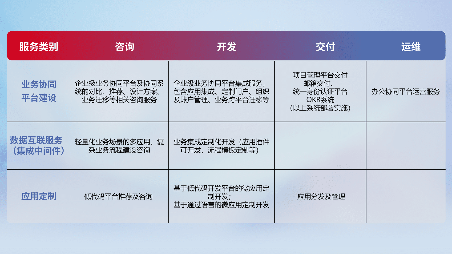 针对钉钉、、企微、、IDaas等平台级产品提供产品的规划、、方案、、、、交付、、定制化开发等服务,,,实现如统一协同办公、、智能客户服务、、、混合会议管理、、、、智能数据查询、、、等业务场景,,实现数字化转型。。